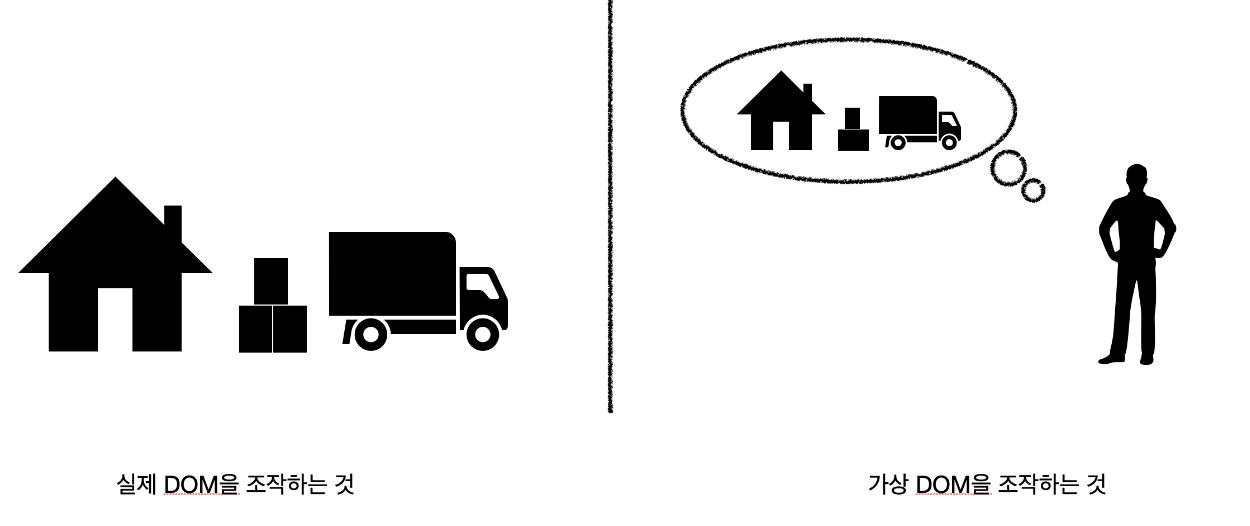 :평범한 자바스크립트 객체이므로 실제 DOM을 건드리지 않고도 필요한 만큼 자유롭게 조작 가능