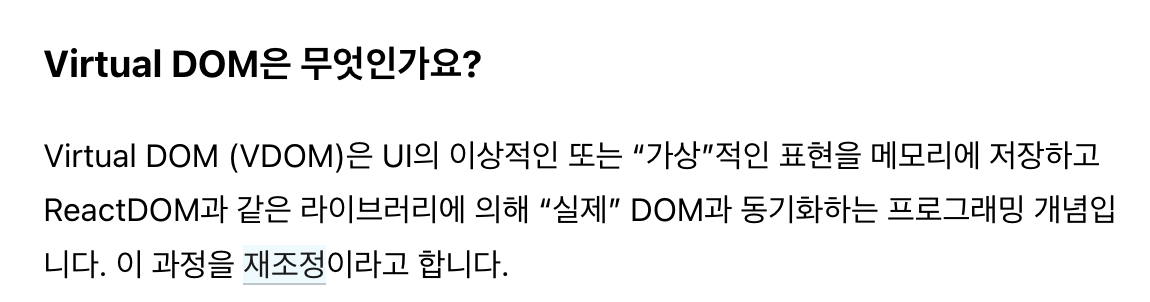 재조정: virtual dom과 실제 dom을 비교하고 일치시키는 과정
