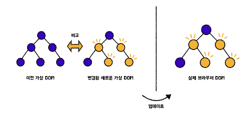 3.이후 렌더링 이전에 화면의 내용을 담고 있는 첫번쨰 가상 돔과 업데이트 이후의 내용을 담고 있는 두번째 가상 돔을 비교해서 정확히 어느 엘리먼트 들이 변했는지 찾아냄