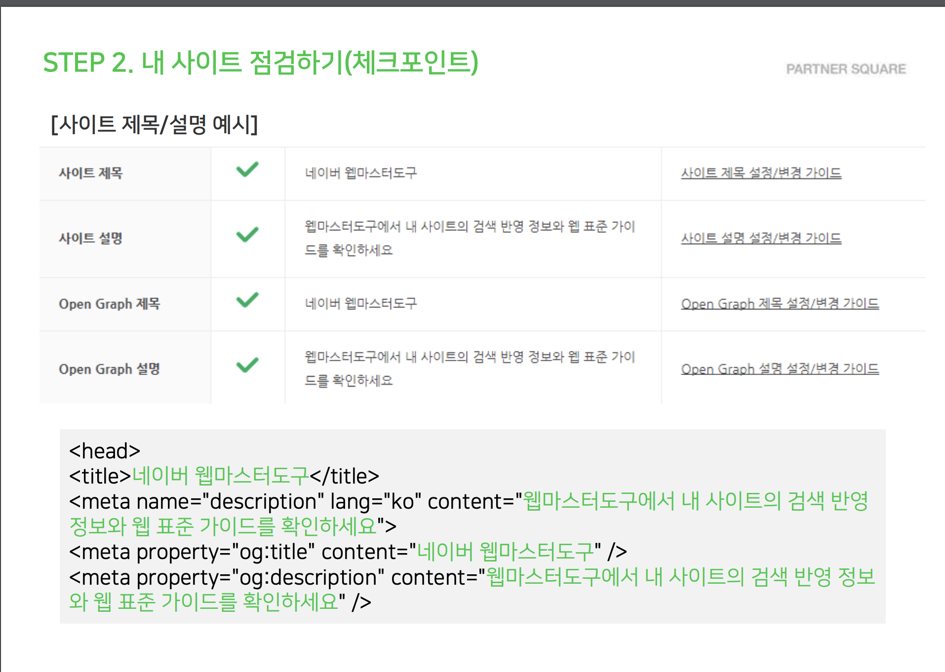 검색 엔진이 페이지의 제목을 보다 정확하게 이해할 수 있도록 도와주는 태그입니다. - <meta name="description" content="...">