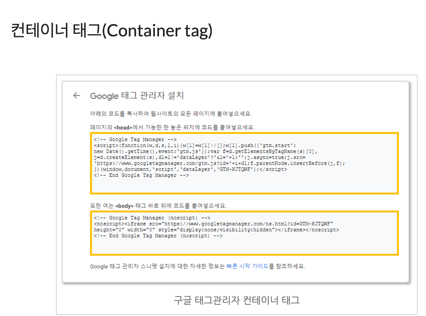 GTM을 적용하기 위해서는 HTML 문서 내에 두 가지 주요 코드를 삽입해야 합니다.